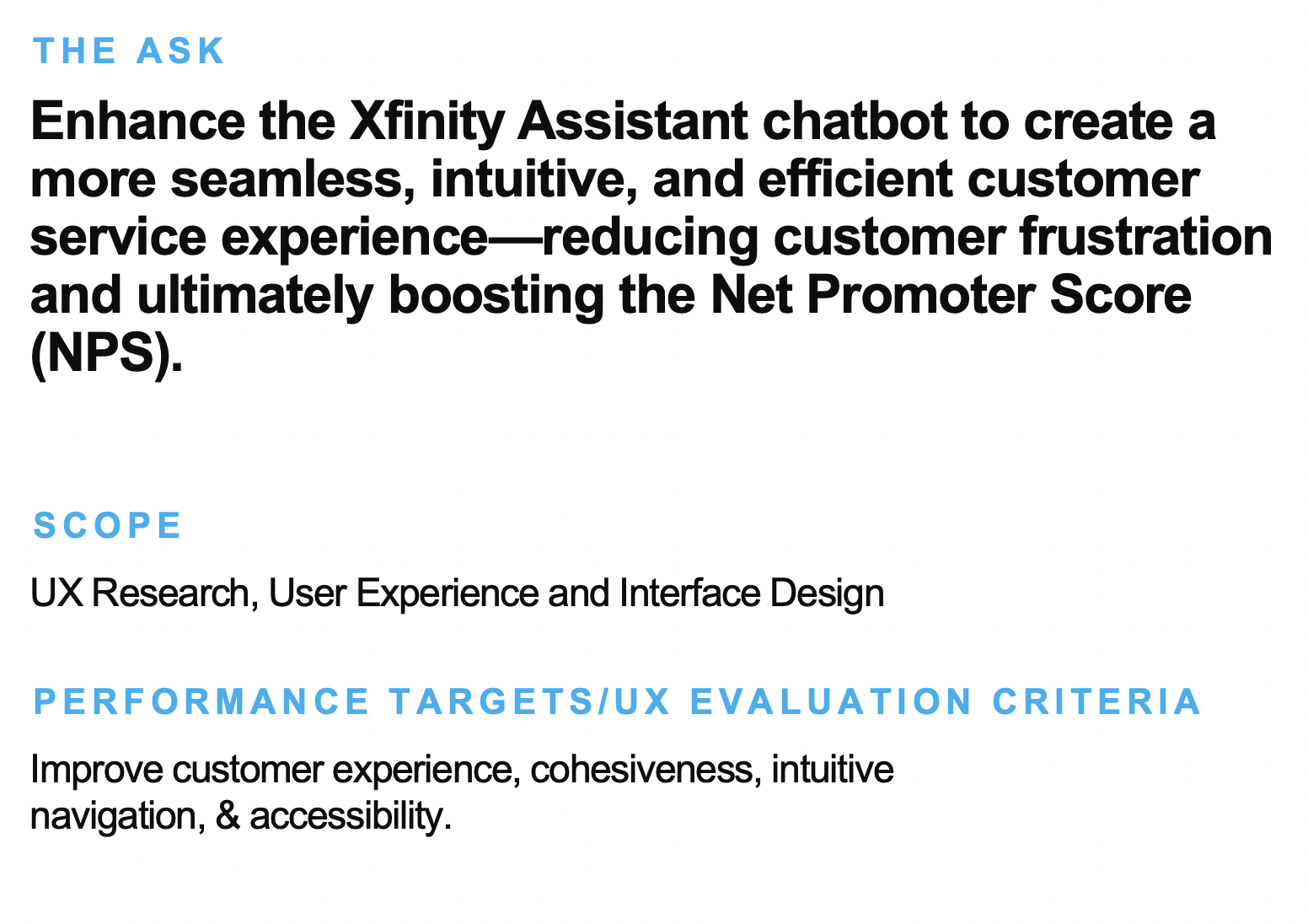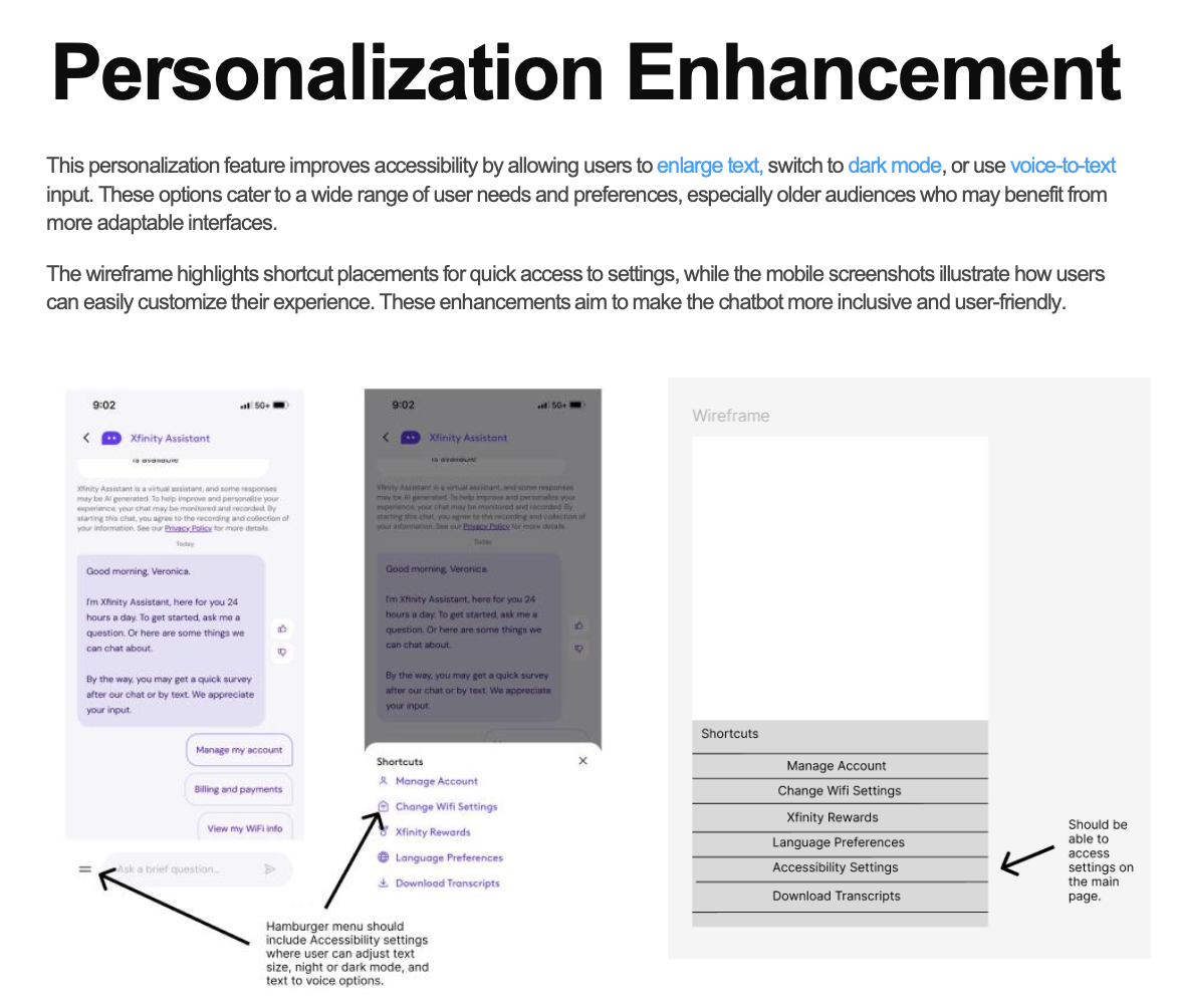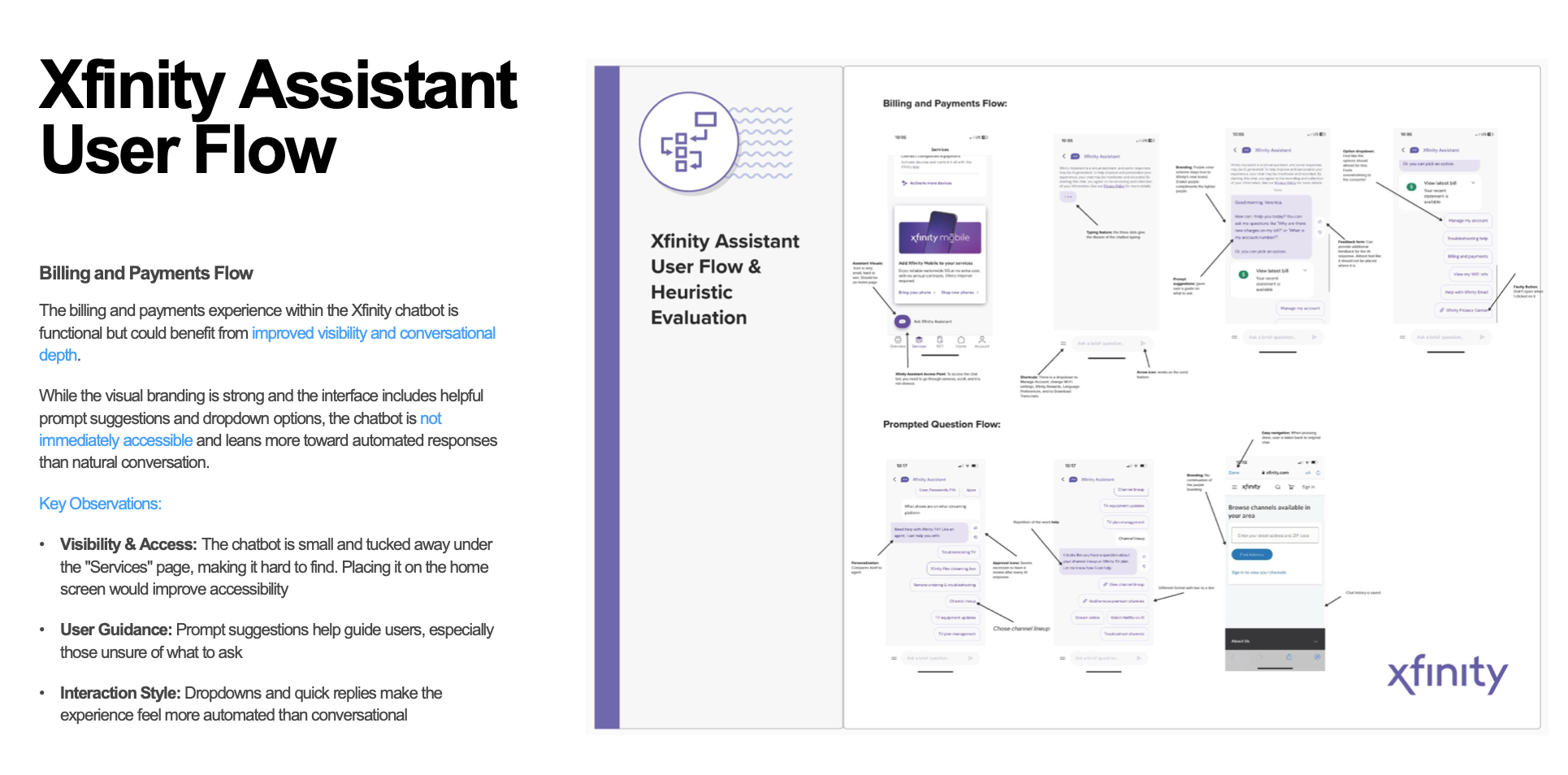 Conducted end-to-end UX research, competitive analysis, and journey mapping to enhance the Xfinity Assistant chatbot. Designed wireframes and mobile mockups focused on improving discoverability and personalization, including homepage integration, time-aware greetings, accessibility features, and customizable layouts. Delivered actionable recommendations to boost user satisfaction, resolution rates, and Net Promoter Score.